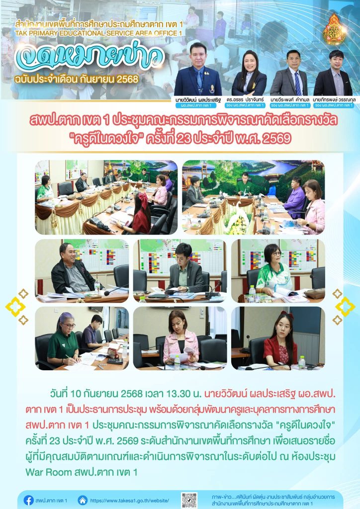 วันที่ 10 กันยายน 2568 เวลา 13.30 น. ข้าพเจ้าได้รับการแต่งตั้งให้ร่วมเป็นคณะกรรมการพิจารณาคัดเลือกรางวัล”ครูดีในดวงใจ” ครั้งที่ 23 ประจำปี พ.ศ. 2569 โดยมีนายวิวัฒน์ ผลประเสริฐ ผอ.สพป.ตาก เขต 1 เป็นประธานการประชุม พร้อมด้วยกลุ่มพัฒนาครูและบุคลากรทางการศึกษา สพป.ตาก เขต 1 ระดับสำนักงานเขตพื้นที่การศึกษา เพื่อเสนอรายชื่อผู้ที่มีคุณสมบัติตามเกณฑ์และดำเนินการพิจารณาในระดับต่อไป ณ ห้องประชุม War Room สพป.ตาก เขต 1