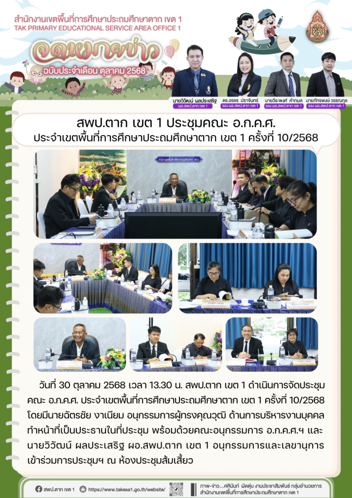วันที่ 29 กันยายน 2568 เวลา 13.30 น. ข้าพเจ้าได้เข้าร่วมประชุมกับคณะ อ.ก.ค.ศ. ประจำเขตพื้นที่การศึกษาประถมศึกษาตาก เขต 1 ครั้งที่ 9/2568 โดยมีนางสาวมนิดา อดิศัยสกุล ประธาน อ.ก.ค.ศ.ฯ เป็นประธานการประชุม โดยมี ดร.อรชร ปราจันทร์ รอง ผอ.สพป.ตาก เขต 1 ผู้ช่วยเลขานุการ ณ ห้องประชุมส้มเสี้ยว สพป.ตาก เขต 1