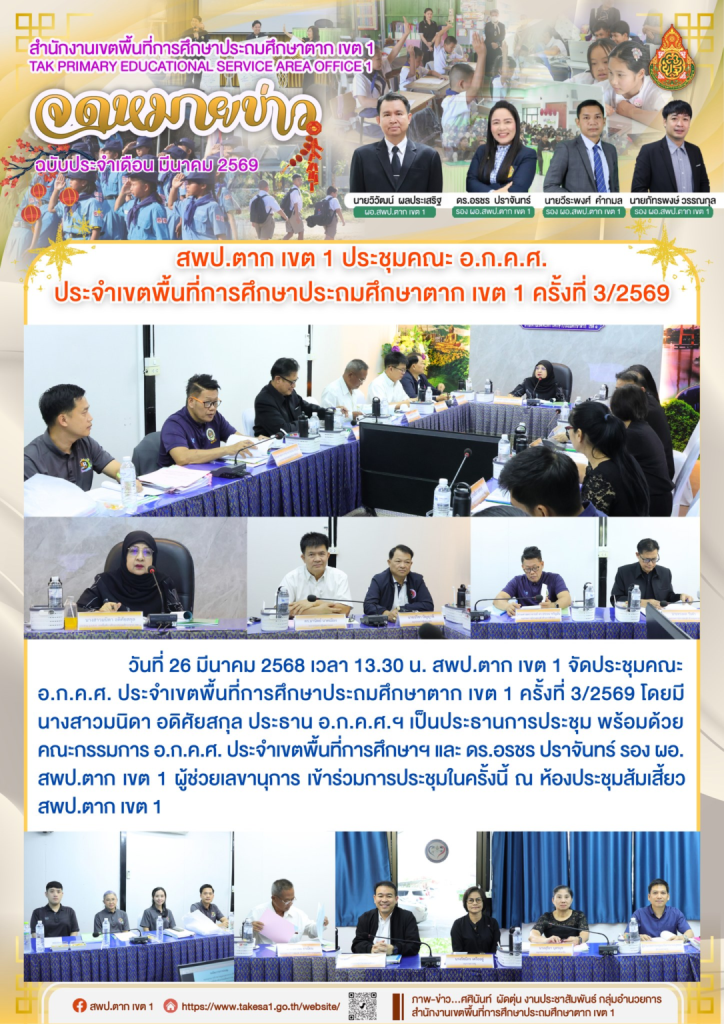 วันที่ 26 มีนาคม 2568 เวลา 13.30 น. ได้เข้าร่วมประชุมในนามผู้แทนครูใน อ.ก.ค.ศ. ประจำเขตพื้นที่การศึกษาประถมศึกษาตาก เขต 1 ครั้งที่ 3/2569 โดยมีนางสาวมนิดา อดิศัยสกุล ประธาน อ.ก.ค.ศ.ฯ เป็นประธานการประชุม