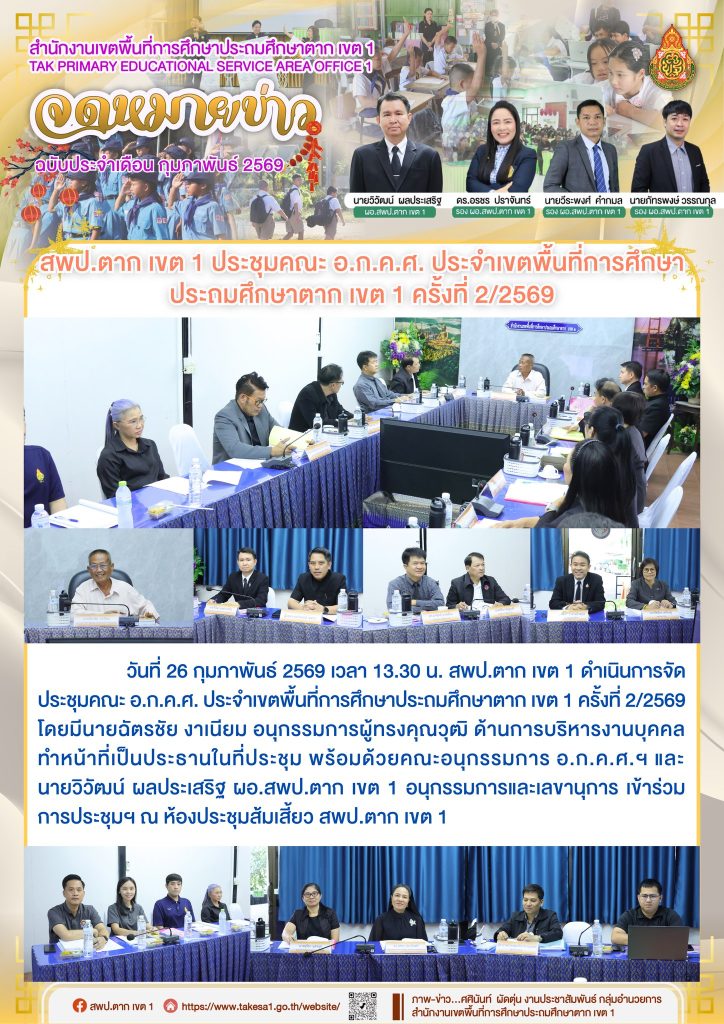 วันที่ 26 กุมภาพันธ์ 2569 เวลา 13.30 น. เข้าร่วมประชุมในฐานะผู้แทนครูใน อ.ก.ค.ศ. ประจำเขตพื้นที่การศึกษาประถมศึกษาตาก เขต 1 ครั้งที่ 2/2569 โดยมีนายฉัตรชัย งาเนียม อนุกรรมการผู้ทรงคุณวุฒิ ด้านการบริหารงานบุคคล ทำหน้าที่เป็นประธานในที่ประชุม พร้อมด้วยคณะอนุกรรมการ อ.ก.ค.ศ.ฯ และ นายวิวัฒน์ ผลประเสริฐ ผอ.สพป.ตาก เขต 1 อนุกรรมการและเลขานุการ เข้าร่วมการประชุมฯ ณ ห้องประชุมส้มเสี้ยว สพป.ตาก เขต 1